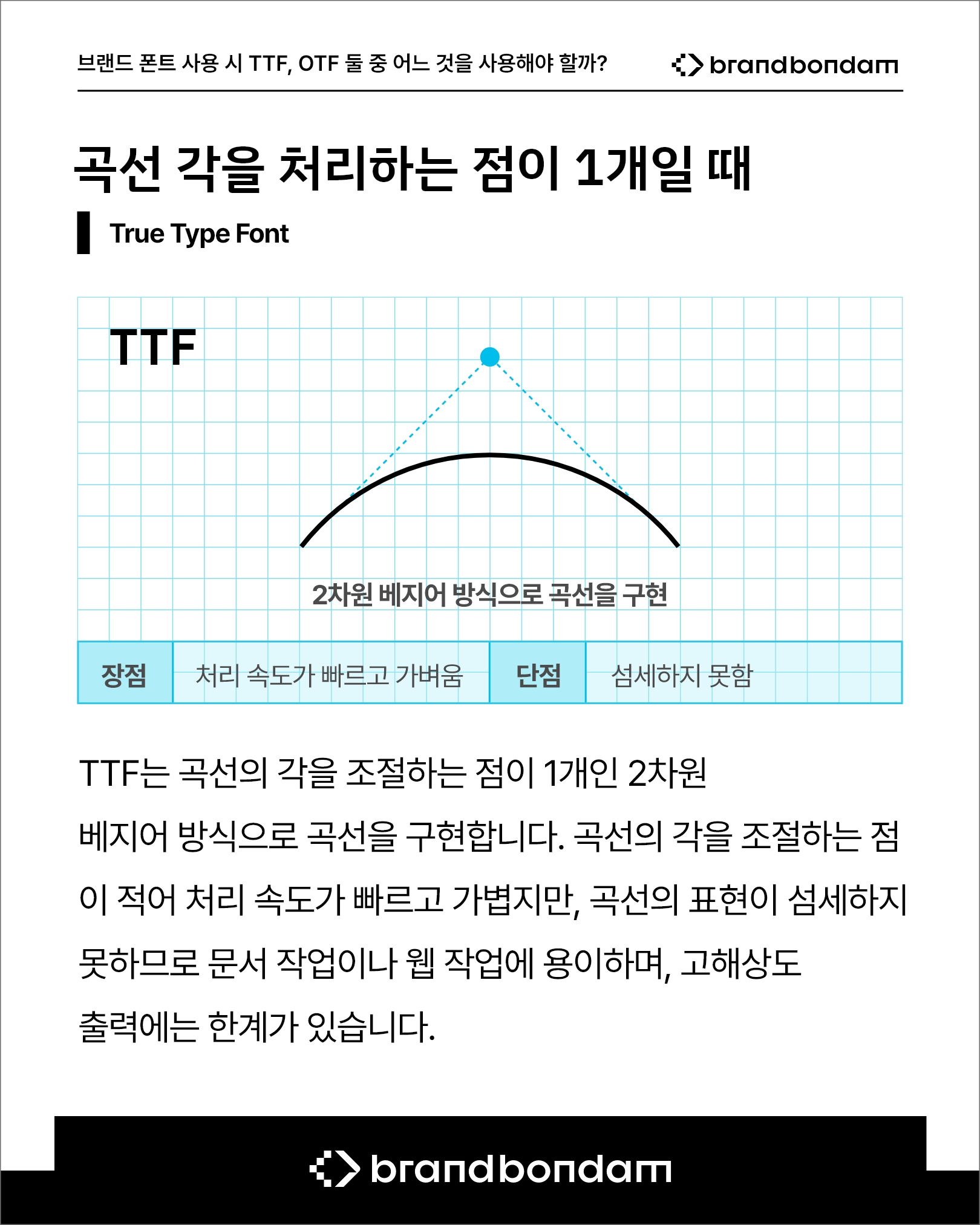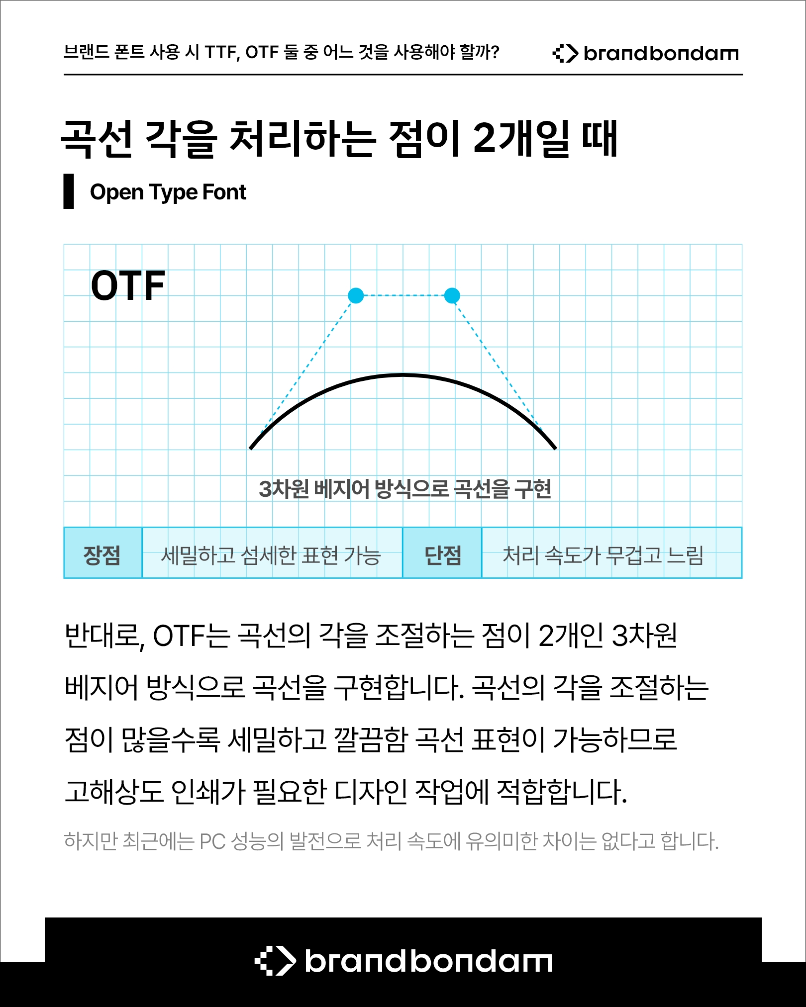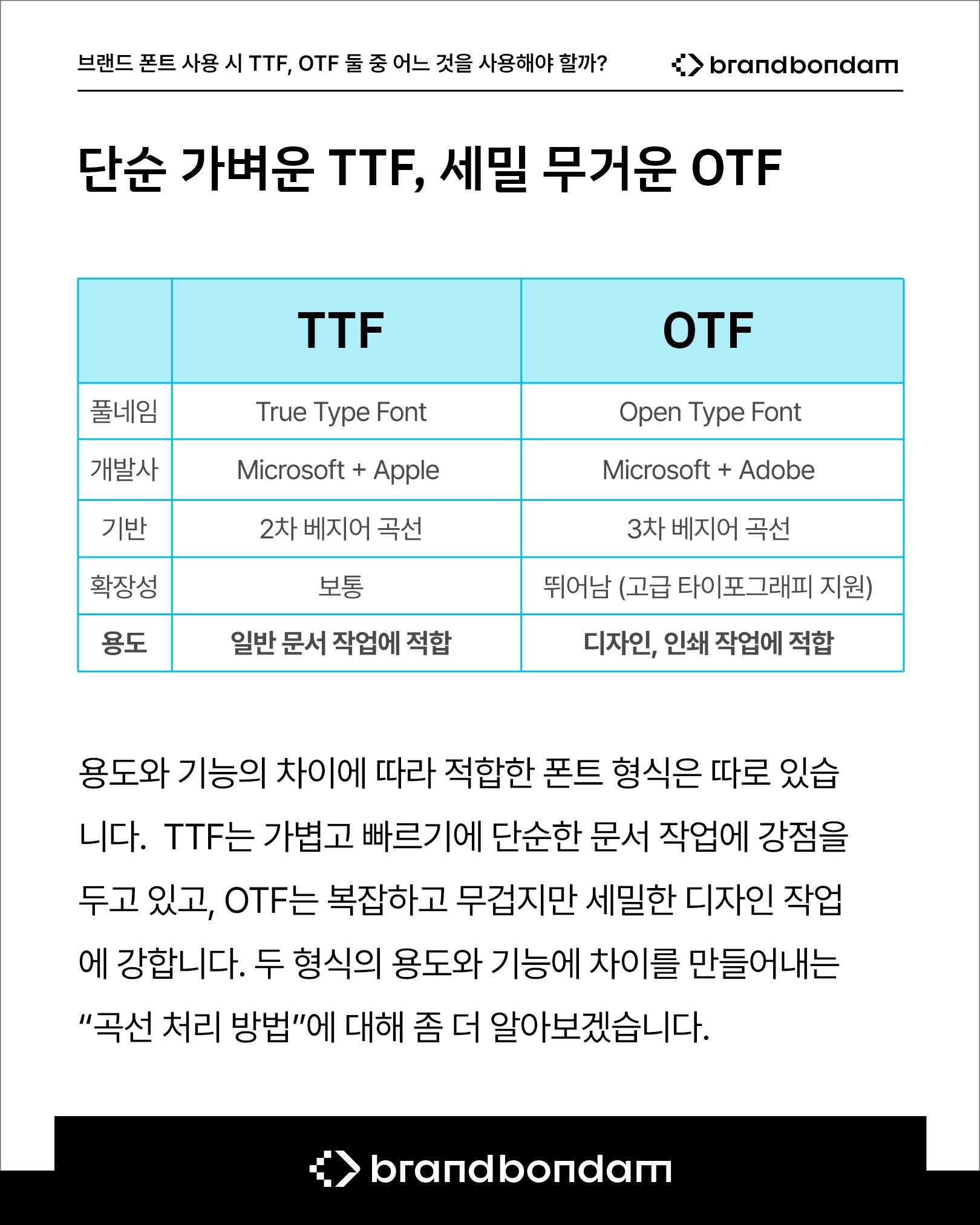 TTF는 가볍고 빠르기에 단순한 문서 작업에 강점을 두고 있고, OTF는 복잡하고 무겁지만 세밀한 디자인 작업에 강합니다.