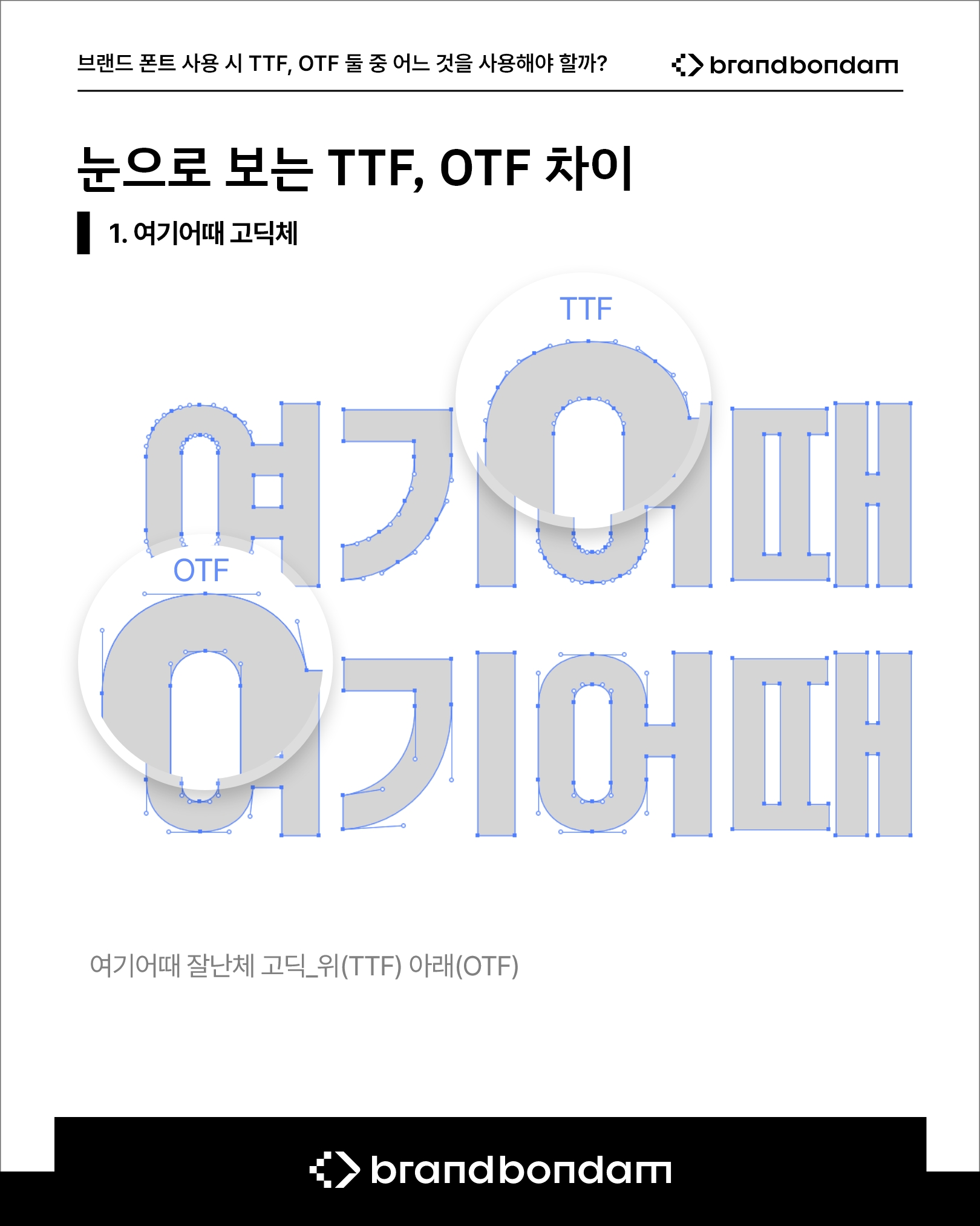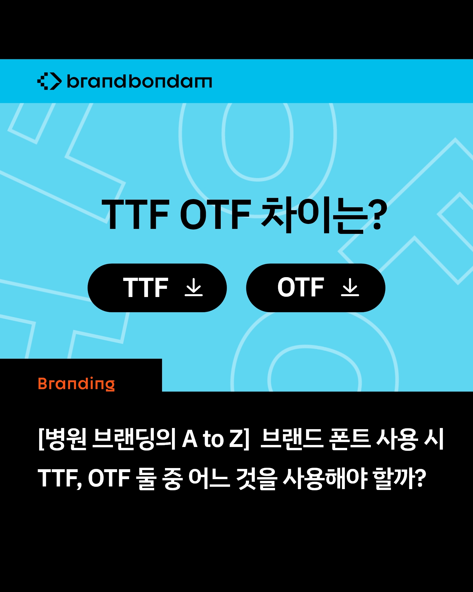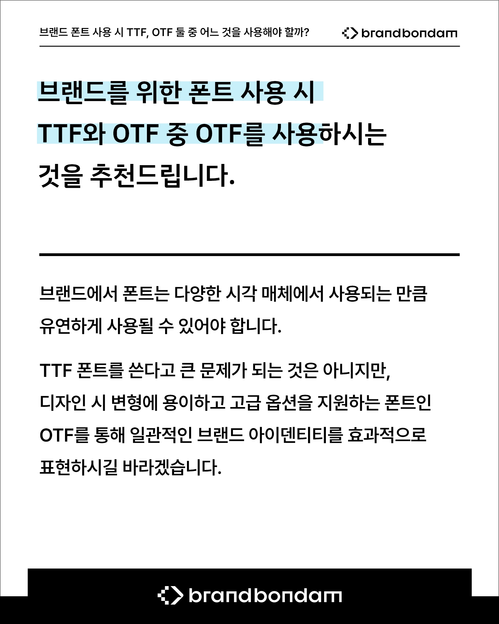 TTF 폰트를 쓴다고 문제가 되는 것은 아니지만, 디자인 시 변형에 용이하고 고급 옵션을 지원하는 폰트인 OTF를 통해 일관적인 브랜드 아이덴티티를 효과적으로 표현하시길 바라겠습니다.