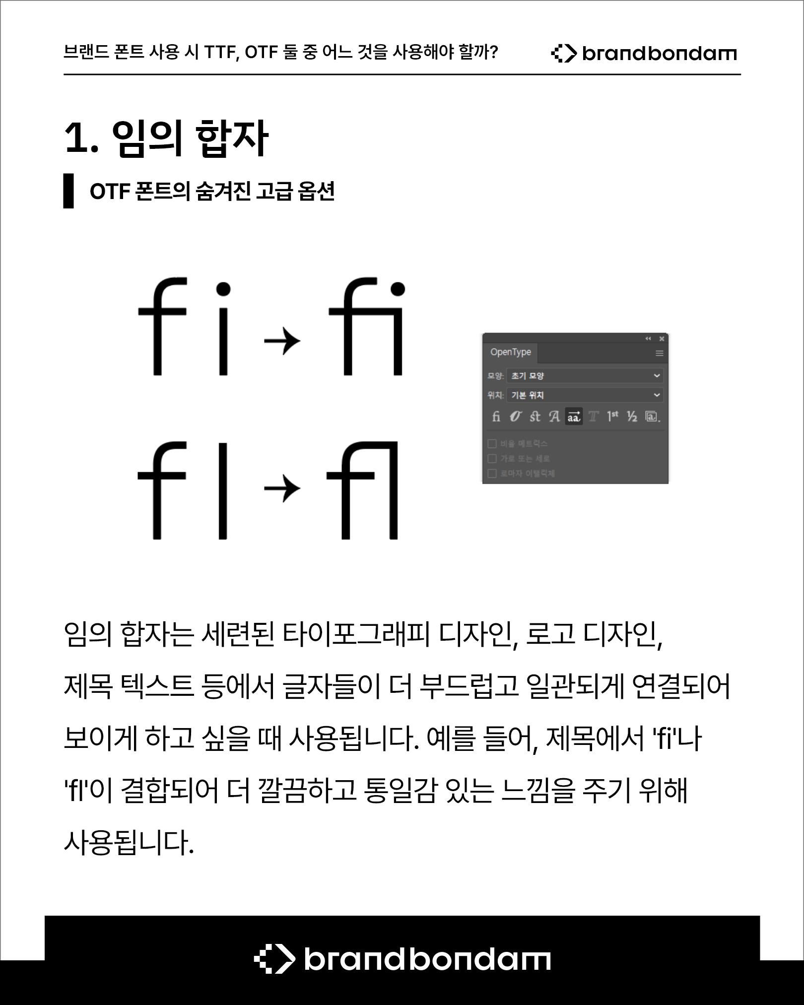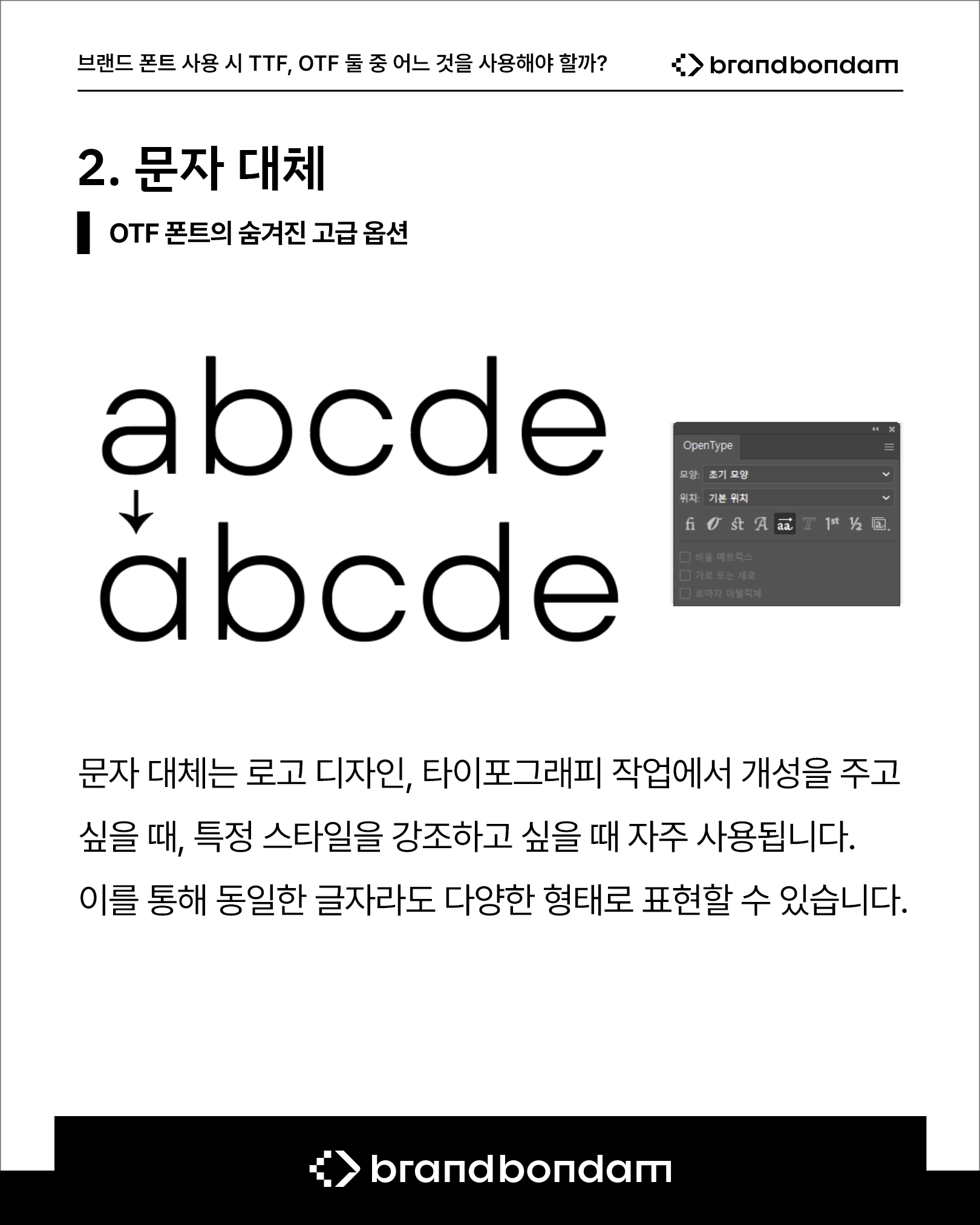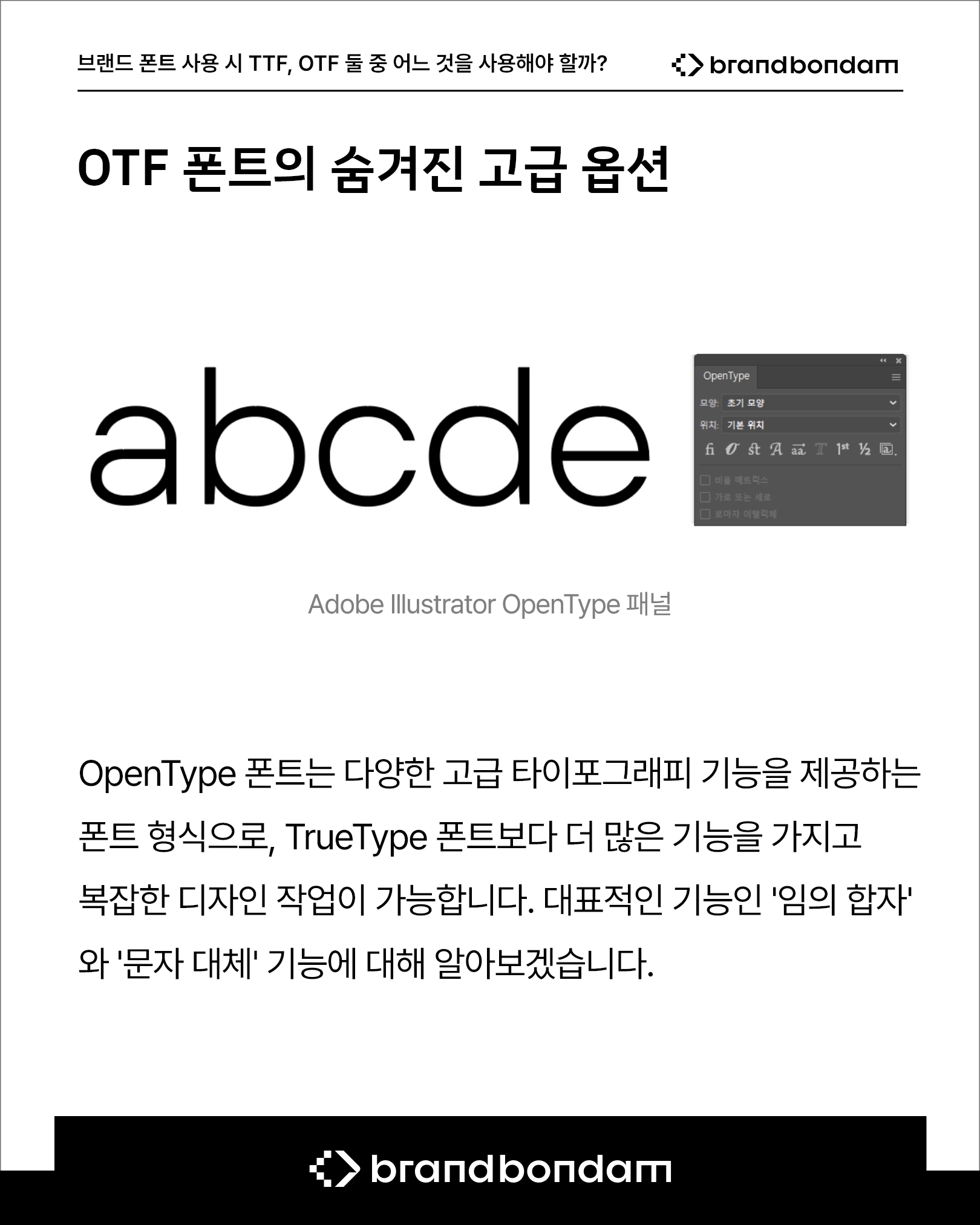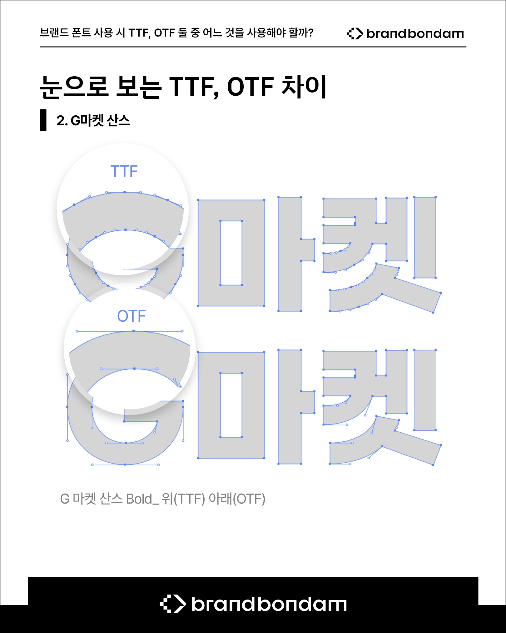 TTF 폰트를 쓴다고 문제가 되는 것은 아니지만, 디자인 시 변형에 용이하고 고급 옵션을 지원하는 폰트인 OTF를 통해 일관적인 브랜드 아이덴티티를 효과적으로 표현하시길 바라겠습니다.