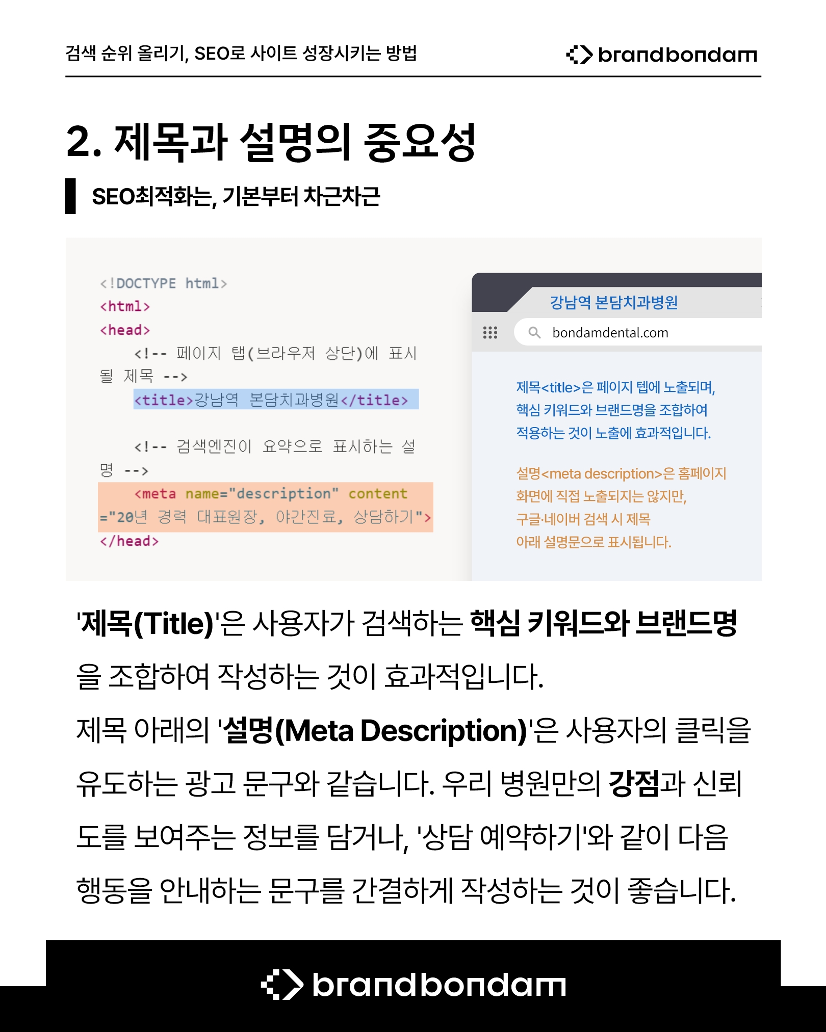 예를 들어, '강남역 치과 | 00치과'와 같이, [지역명 + 서비스명]을 제목 앞부분에 명시하면 특정 목적을 가진 사용자의 검색 결과에 노출될 확률이 크게 높아집니다.