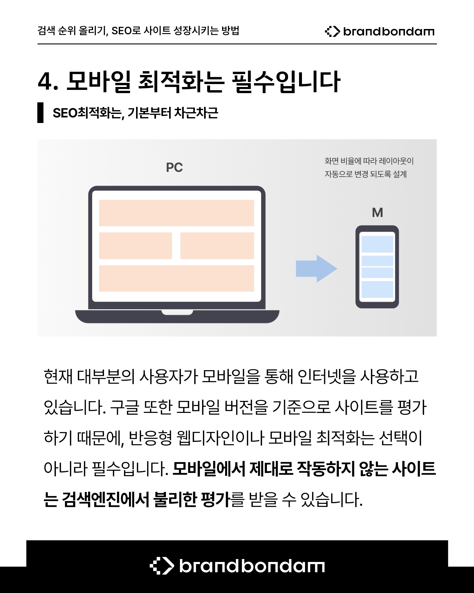 구글 또한 모바일 버전을 기준으로 사이트를 평가하기 때문에, 반응형 웹디자인이나 모바일 최적화는 선택이 아니라 필수입니다.