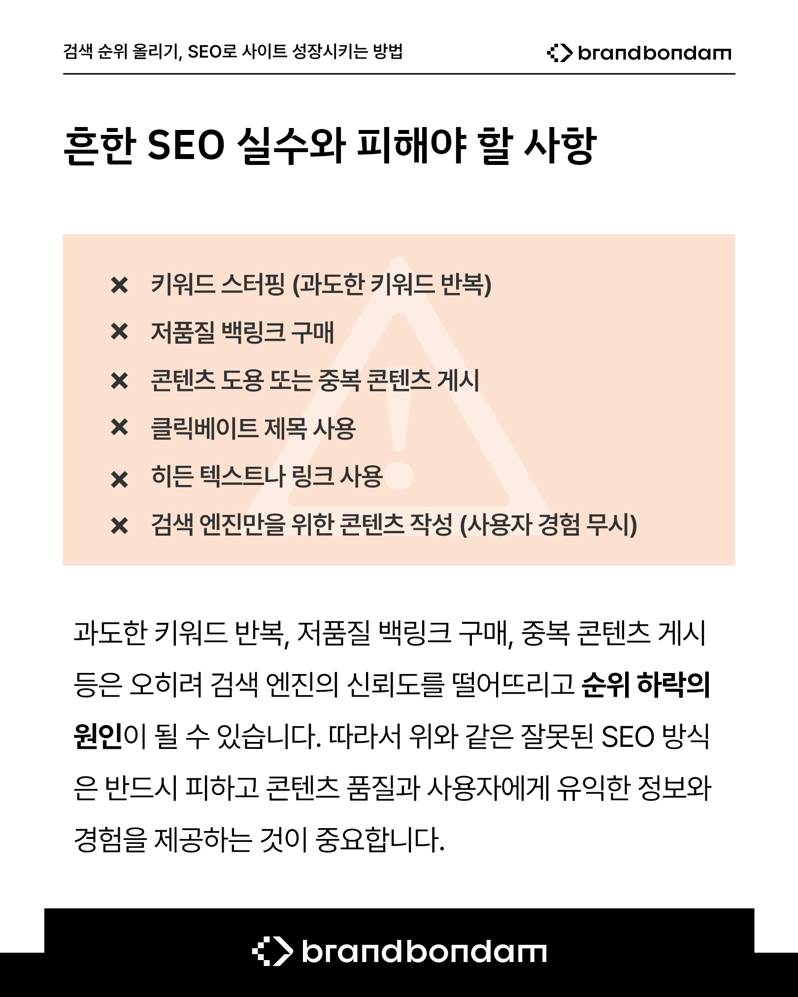 - 검색 엔진만을 위한 콘텐츠 작성 (사용자 경험 무시)
