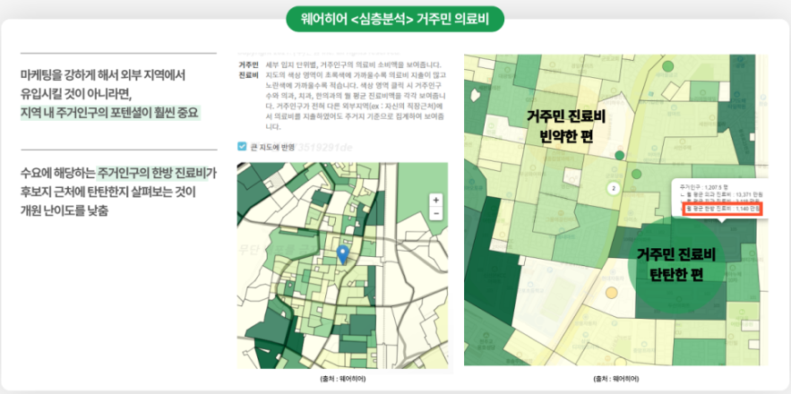 거주민 진료비는 해당 지역 거주민들이 지출하는 전체 의료비를 의미하며, 지역 내뿐만 아니라 외부에서 지출되는 의료비까지 포함합니다. 이는 지역 내에서 충분한 의료 수요가 있는지를 파악할 수 있는 중요한 지표로, <웨어히어>의 심층분석 코너에서 살펴볼 수 있습니다.