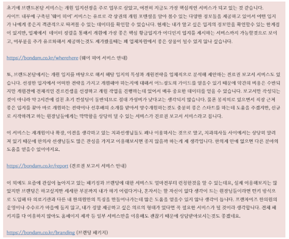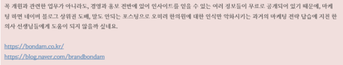 해당 원장님께서, 본담의 서비스뿐만 아니라 무료로 제공하고 있는 경영과 마케팅 tip에 대해서도 언급 주셨습니다. 관심 있는 원장님은 아래에 안내드리는 홈페이지 칼럼을 방문하시면 도움 되실 것 같습니다.
