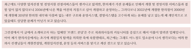 한의사 커뮤니티의 개원 및 경영 정보 부족과 그로 인한 시스템 정체에 대해 많이 아쉬워하셨습니다. 그에 대해 고민하던 중 치과의사 커뮤니티에서 저희 '브랜드본담'의 서비스를 접하셨다고 합니다.