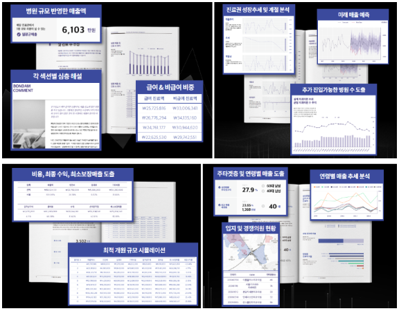 브랜드본담은 정부 및 민간 기관 등과 협약된 전국 수 조 건의 '의료 데이터'를 기반으로, 치과, 한의과, 의과 등 모든 의료과 대상 및 개별과의 특성에 맞는 병원 경영, 신규/인수 개원에 도움드리고 있습니다. 한의원 개원 뿐만 아니라 의원 개원, 치과 개원, 대형병원 등의 수요측정을 통해 건설사, 제약사 등 여러곳에 솔루션을 제공하고 있습니다.