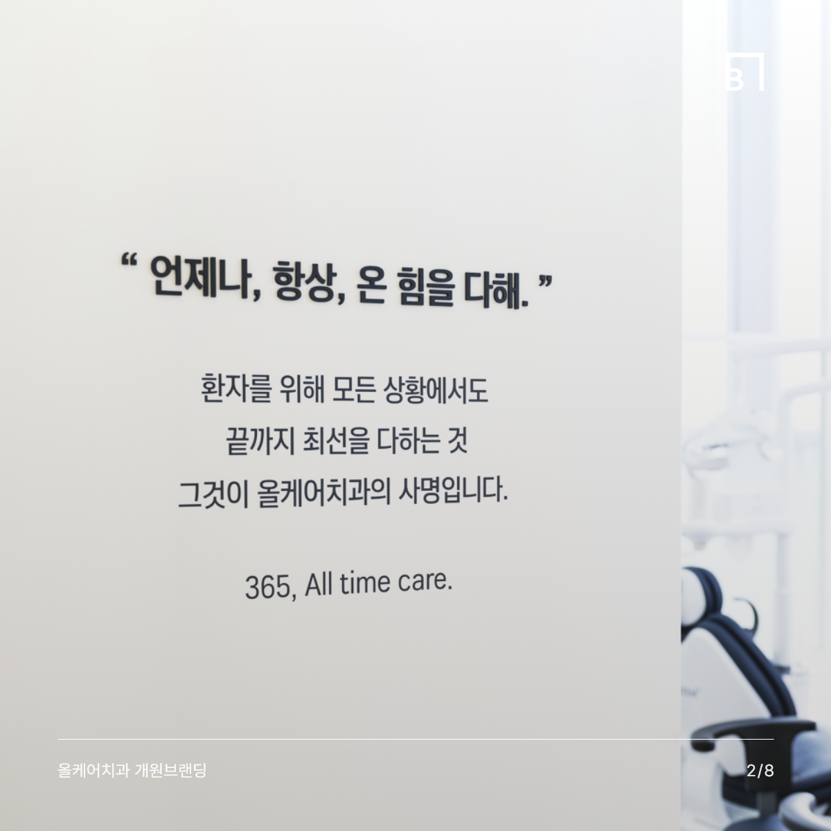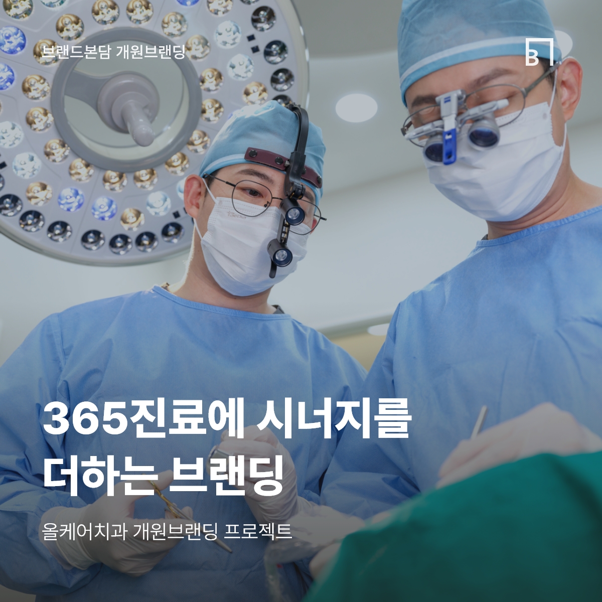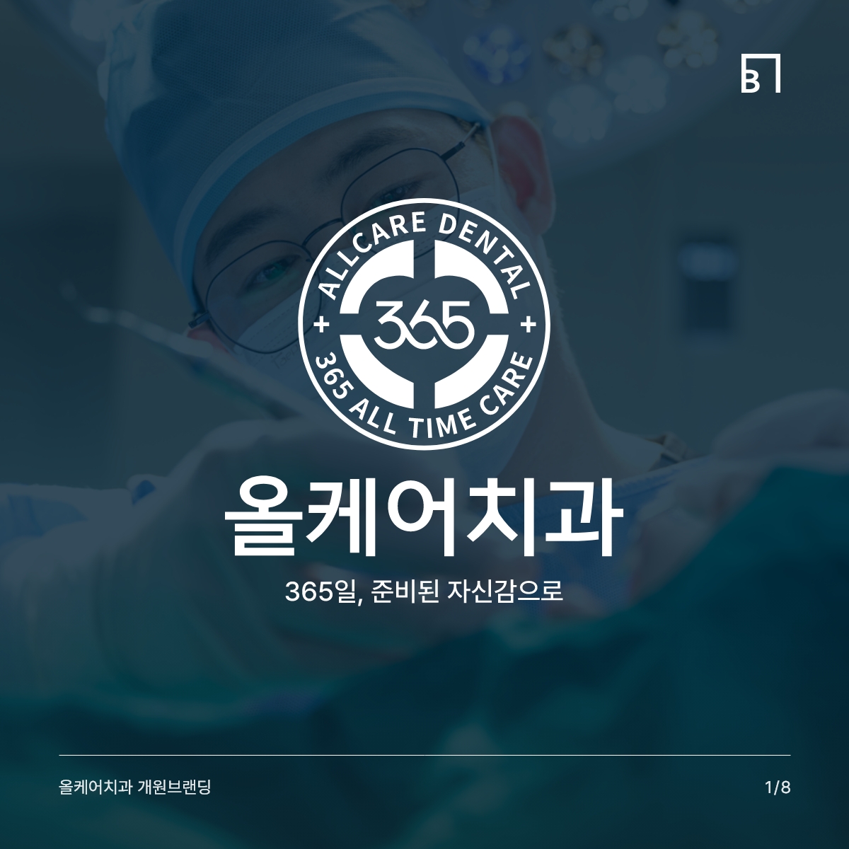 이와 같은 진료적 강점과 365일 진료는 시너지가 더해져 모든 상황, 모든 진료, 모든 시간 속에서 올케어가 가능한 치과라는 원장님만의 진료철학과 차별점을 강조할 수 있도록 브랜딩 컨셉을 구축했습니다.