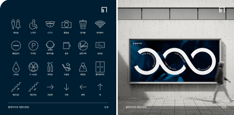 이후 연결된 숫자와 원형의 프레임, 패턴을 통해 올케어치과의 브랜드 무드와 자신감을 표현합니다.